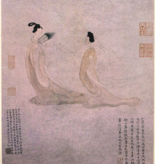 传说中尧之长女蛾皇。尧有二女娥皇、女英,同为舜妻。舜弟象欲害舜,二女助舜脱险。舜为天子,娥皇为后,女英为妃。后舜南巡,二女征,俱死于江、湘之间。后传即《九歌》中的“湘夫人”、“湘君”。湘君湘夫人图轴为明文徵明绘,故宫博物院藏。娥皇、女英像取自清颜鉴题诗,清王翙绘图,嘉庆间颜氏刻本《百美新咏》。