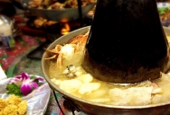 在长春有这样一家店,店名叫八大碗手擀面,却少有点面的。翻翻菜单各式东北菜一应俱全,味道更是没话说。轿子里抬上来的笨鸡锅是店里的特色菜,敲锣打鼓,整场的气氛都high起来;店里的大棒骨不仅味道好吃,而且超级实惠。点上几块架在火炉上,肉和骨髓的味道都香极了;酸菜锅自然是东北菜中必不可少的菜式,来份海鲜酸菜锅,材料丰富,味道自然超极棒。