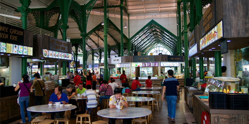老巴刹美食中心位于一座精美的铸铁建筑物内,曾经是个菜市场(Telok Ayer Market),现在这里是熟食中心,聚集了各种当地美食摊档,从沙爹到海鲜烧烤,应有尽有,所有档口24小时开放。