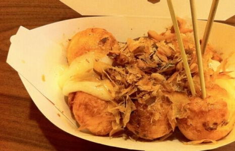 日船章鱼小丸子,主要特色是老板从日本引进的料理技术加上配制的酱料,再配上章鱼快、高丽菜和洋葱,使得制作出的小丸子特别有味,咬下去满口溢香,非常美味。章鱼丸子40NT/份,除此之外还有木瓜牛奶60NT/杯,卤味鸡翅 10NT/2只,不同串串35NT/份,豆皮卷金针菇,味道都相当不错。