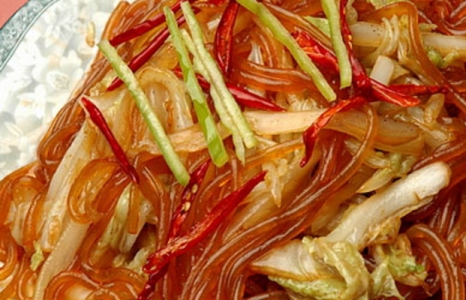 主要原料是酸菜,粉丝,配料是盐,味精等。将酸菜切丝,粉丝泡软,然后将粉丝和酸菜一起下锅炒熟加调料即可。酸爽可口,老少皆宜。是北方特有的菜肴,可以去除油腻。