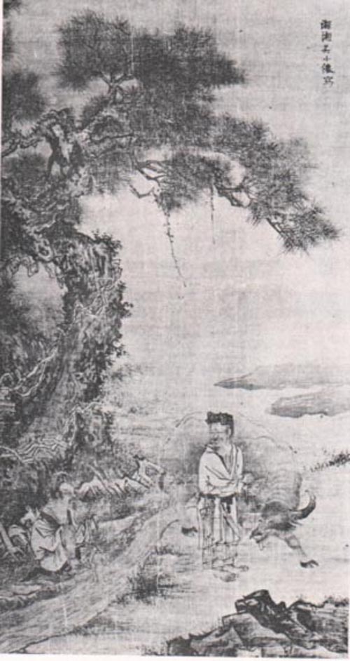 远古尧时隐士。尧欲让天下于由,由遁于萁山之下。《许由巢父图》明吴伟绘,东京国立博物馆藏。许由像取自晋皇甫谧撰,清任熊绘,蔡照初雕版,清咸丰八年王氏养和堂刻本《高士传》。