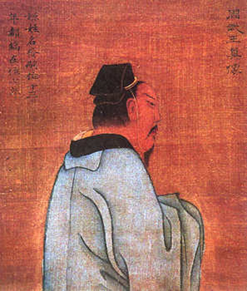 即周武王,西周开国国君,文王子,嗣为西伯。遵文王灭商遗志,盟诸侯于孟津,兴师伐纣。牧野之战大胜,灭商,建立周王朝,都镐(今陕西西安西南),分封诸侯。灭商二年后而死,在位十九年。姬发像取自明天然撰赞,弘治十一年重刻本《历代古人像赞》。姬发画像现藏台北故宫博物院。