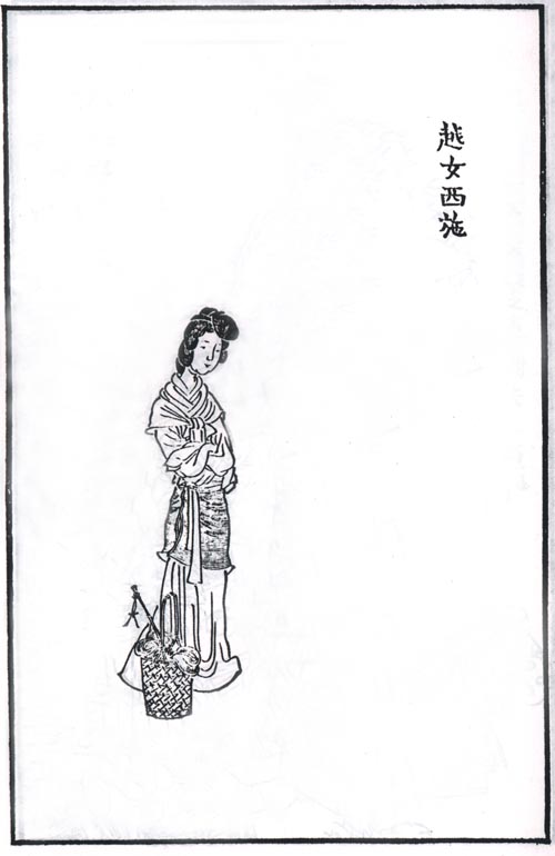 春秋末期越国美女。貌美,为当时所艳称。初在若耶溪浣纱,为文种觅得。越王勾践败于会稽,用范蠡谋,献之与吴王夫差,有殊宠。相传吴亡后复归范蠡,泛五湖而去。《列女传图—西施戏瓢》为明代仇英所绘。《西施浣纱图》为清任颐绘。西施像取自清任熊绘图,王龄撰赞,蔡照初雕版,清咸丰六年萧山王氏养和堂刻本《於越先贤像传赞》。西施浣纱像取自清颜鉴题诗,清王翙绘图,嘉庆间颜氏刻本《百美新咏》。