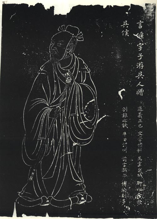 春秋末期孔子弟子。列文学科。仕鲁为武城宰,以礼乐教民。孔子过武城,闻弦歌之声,嘉许之。言偃杭州石刻像南宋绍兴二十六年(1156)十二月刻,李龙绘,宋高宗赵构正书赞,为《宣圣及七十二圣贤像》之一。言偃像取自明代王圻辑,万历刻《三才图会》。言偃立像取自明吕维祺编,崇祯刻本《圣贤像赞》。言偃苏州石刻像刻于1827(清道光七年),清孔继尧绘,石蕴玉正书赞,谭松坡镌,为《沧浪亭五百名贤像》之一。言偃半身像取自清代顾沅辑,道光九年刻本《吴郡名贤图传赞》,清孔继尧绘。言偃画像台北故宫博物院藏。