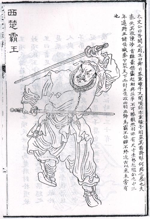 即西楚霸王。战国末楚将项燕后。力能抗鼎,才气过人。陈胜起事,羽与叔父项梁起兵吴中响应。梁败死,羽将其军,击破秦军主力于钜鹿。进军关中,秦亡后,自立为西楚霸王。继与刘邦争衡,被围于垓下,突围至乌江自刎死。项羽题跋像取自明天然撰赞,弘治十一年重刻本《历代古人像赞》。项羽像取自明代王圻辑,万历刻《三才图会》。项羽题跋全身像取自清上官周绘,乾隆八年刻本《晚笑堂画传》。项羽题跋侧身像取自清金史(古良)绘,康熙中叶刻本《南陵无双谱》。霸王别姬图为徐悲鸿绘。