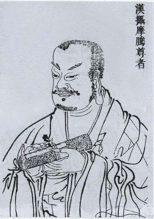 东汉高僧。尝将《金光明经》于天竺,明帝于永平十年遣郎中蔡愔往天竺访求佛法,寻邀摄摩腾、竺法兰来汉,以白马驮佛经佛像至洛阳,明年,帝筑白马寺为二僧居所,合译《四十二章经》是为我国汉译佛经及有僧寺之始。摄摩腾像取自虚云和尚重辑,1935年刊本《佛祖道影》。