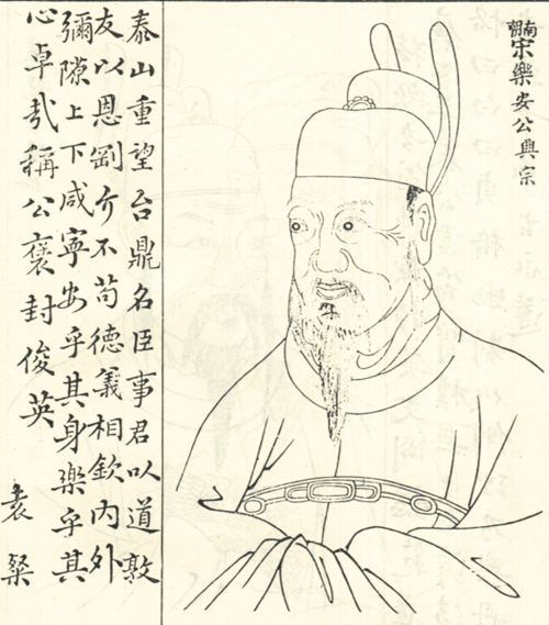 南朝宋大臣,历官司徒行参军、太子舍人、侍中、吏部尚书、新昌太守、尚书右仆射,封安乐县伯,明帝死,受顾命,为征西将军、开府仪同三司,荆州刺史。像取自清同治修《河南始祖蔡氏通谱》。