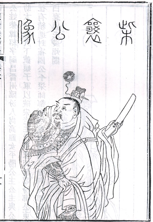 唐初大将,幼以任侠闻。补隋为太子千牛奋身,李渊妻以女平阳公主。渊起兵,绍兼领马军总管,率先登陷阵。高祖武德初,从李世民征战,以功封霍国公。太宗贞观初,转左卫大将军,出为华州刺史,后加镇军大将军。柴绍题跋像取自清刘源绘,朱圭刻,清康熙七年苏州柱笏堂刻本《凌烟阁功臣图》。柴绍半身像取自清顾沅辑,道光十年刻本《古圣贤像传略》。