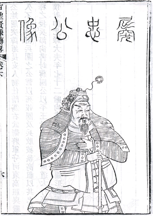 唐初大将。隋炀帝大业中,累迁左骁卫大将军,授关内讨捕大使。唐高祖起兵,守河东,战败被擒,高祖释之,授兵部尚书,封蒋国公。从秦王平薛仁杲、王世充,论攻第一,拜右仆射,镇洛阳,太宗贞观元年进左光禄大夫。屈突通题跋像取自清刘源绘,朱圭刻,清康熙七年苏州柱笏堂刻本《凌烟阁功臣图》。屈突通半身像取自清顾沅辑,道光十年刻本《古圣贤像传略》。