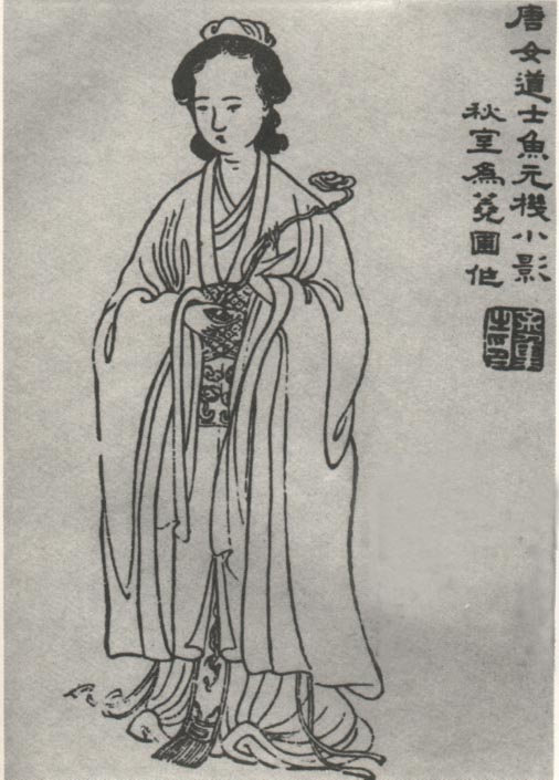 唐代女诗人。好读书,尤工韵调,情致繁缛。懿宗咸通中及笄,为补阙李亿侍妾。夫人妒不能容,遂遣隶西京咸宜观,为女道士。后以笞杀女僮绿翘事下狱,为京兆尹所杀。有集。鱼玄机画像取自清改琦绘《元机诗意图》,故宫博物院藏。