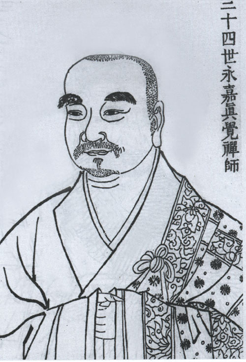 唐代高僧。住温州龙兴寺,尝谒六祖慧能,问答相契,便欲辞去,慧能留住一宿,谓之一宿觉。有《永嘉集》。玄觉像取自虚云和尚重辑,1935年刊本《佛祖道影》。