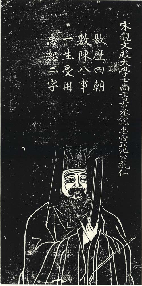 北宋大臣,范仲淹次子,仁宗皇祐元年进士。尝从胡瑗、孙复学。父殁始出仕知襄城县,累官侍御史、同知谏院,出知河中府,徙成都路转运使。哲宗立,除给事中,元祐元年同知枢密院事,后拜相。哲宗亲政,累贬永州安置。范纯仁于徽宗立后,连除观文殿大学士,促入觏,以目疾乞归。有《范忠宣公集》。范纯仁苏州石刻像刻于1827(清道光七年),清孔继尧绘,石蕴玉正书赞,谭松坡镌,为《沧浪亭五百名贤像》之一。范纯仁半身像取自清代顾沅辑,道光九年刻本《吴郡名贤图传赞》,清孔继尧绘。