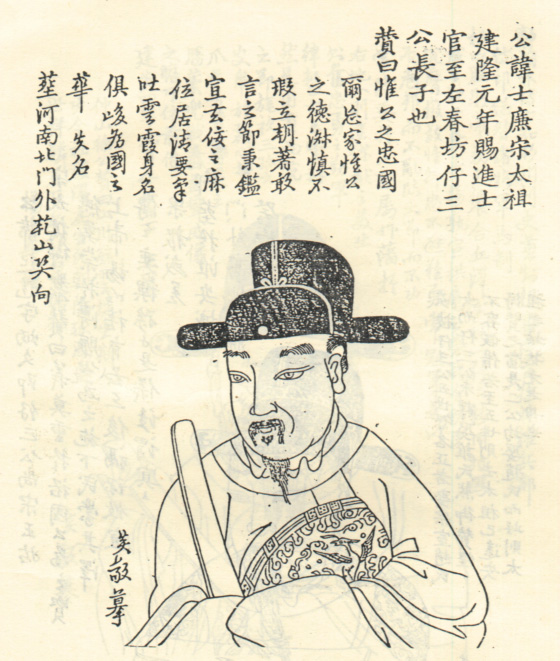 北宋官吏。徐起彪长子。太祖建隆元年进士。仕至左春坊。像取自清代修《浙江姚江徐氏宗谱》。