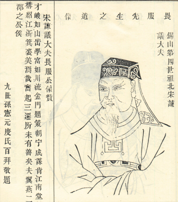 北宋官吏。徐窱子。天禧己未进士。仕至太常寺正卿、谏议大夫。像取自1915年修《江苏毘陵徐氏宗谱》。