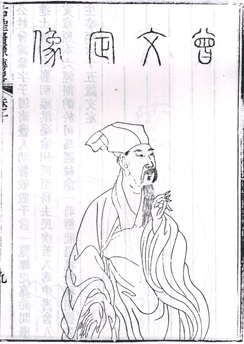 北宋官吏、文学家。仁宗嘉祐二年进士。累官通判越州,历知齐、襄、洪、福诸州,所至多有政绩。神宗元丰三年判三班院。次年加史馆修撰,典修五朝国史,官至中书舍人。尤擅散文,为唐宋八大家之一。曾巩题跋像取自清上官周绘,乾隆八年刻本《晚笑堂画传》。曾巩半身像取自清顾沅辑,道光十年刻本《古圣贤像传略》。曾巩半身之像《集古像赞》。