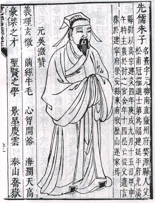 南宋官吏、哲学家、教育家。高宗绍兴十八年进士,为同安主簿,孝宗淳熙中知南康军,改浙东茶盐提举,光宗时历漳州知府、秘阁修撰。宁宗初以焕章阁待制提举南京鸿庆官。庆元二年,落职罢祠。朱熹受业于李侗,得程颢、程颐之传,兼采周敦颐、张载等人学说,集北宋以来理学之大成。主持白鹿洞、岳麓书院,讲学五十余年,弟子众多。其学派被称为闽学,或考亭学派、程朱学派。有《四书章句集注》、《伊洛渊源录》、《名臣言行录》、《资治通鉴纲目》、《诗集传》、《楚辞集注》,及后人编纂的《朱子语录》、《朱文公文集》等。朱熹像取自明代王圻辑,万历刻《三才图会》。朱熹立像取自明吕维祺编,崇祯刻本《圣贤像赞》。朱熹题跋像取自清上官周绘,乾隆八年刻本《晚笑堂画传》。朱熹半身像、头像台北故宫博物院藏。