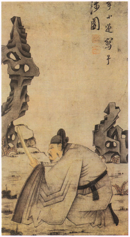北宋官吏、书画家。以恩补浛光尉,历知庸丘县、涟水军,以太常博士知无为军。徽宗时召为书画学博士,擢礼部员外郎,出知淮阳军。米芾举止怪异,有洁癖。能诗文,擅书画,精鉴别。书法得王献之之笔意,尤工行草。画山水人物多以水墨点染,自名一家。有《宝晋英光集》、《书史》、《画史》、《宝章待访录》等。《米芾拜石》为明末陈洪绶绘。《设色米颠拜石图本》为清陈宇绘。《米颠拜石》清任伯年绘,南京博物院藏。《米颠拜石图》清任伯年绘,中国美术馆藏。米芾苏州石刻像刻于1827(清道光七年),清孔继尧绘,石蕴玉正书赞,谭松坡镌,为《沧浪亭五百名贤像》之一。米芾像取自清代顾沅辑,道光九年刻本《吴郡名贤图传赞》,清孔继尧绘。