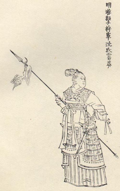 明末女将。能骑射,通经史。明崇祯间,父任道州守备,随往任所。张献忠攻道州,父战死,入阵夺父尸还。授游击将军,继父守道州。及夫贾某战死荆州,辞官扶父柩归,授徒乡里。沈云英像取自清任熊绘图,王龄撰赞,蔡照初雕版,清咸丰六年萧山王氏养和堂刻本《於越先贤像传赞》。