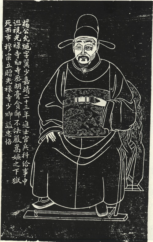 明代官吏。嘉靖二十三年进士。授行人,迁兵科给事中,数言事,诏皆从之,后巡视光禄寺,劾寺丞胡膏伪赠物直,为膏所谮,竟坐诛,天启时追谥忠恪。杨允绳石刻像取自清光绪十七年(1891)徐璋绘并正书誌,朱少渔刻,席云山镌《松江邦彦图》。