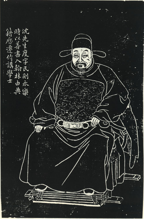 明代官吏、书法家。洪武中以文学举,不就,坐累谪云南,永乐时,以荐擢翰林典籍,官至翰林学士。沈度像、沈度半身像为明人绘,无款,现藏南京博物院。石刻像取自清光绪十七年(1891)徐璋绘并正书誌,朱少渔刻,席云山镌《松江邦彦图》。