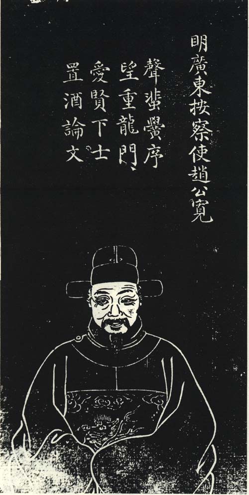 明代官吏。成化十七年进士。授刑部主事,官至广东按察使,工诗。赵宽像取自清代顾沅辑,道光九年刻本《吴郡名贤图传赞》,清孔继尧绘。石刻像刻于1827(清道光七年),清孔继尧绘,石蕴玉正书赞,谭松坡镌,为《沧浪亭五百名贤像》之一。