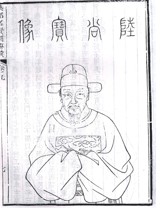 明代官吏、学者。历官工部主事、礼部主事、尚宝司少卿,嘉靖十七年进士,师事文征明,工小楷、古篆,有《左史子汉镌》、《五湖集》。陆师道苏州石刻像刻于1827,清孔继尧绘,石蕴玉正书赞,谭松坡镌,为《沧浪亭五百名贤像》之一。陆师道半身像取自清顾沅辑,道光九年刻本《吴郡名贤图传赞》,清孔继尧绘。