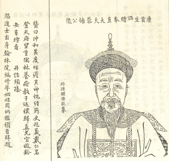 清代官吏。廪贡生。仕至刑部四川司主事。像取自清代修《浙江姚江徐氏宗谱》。
