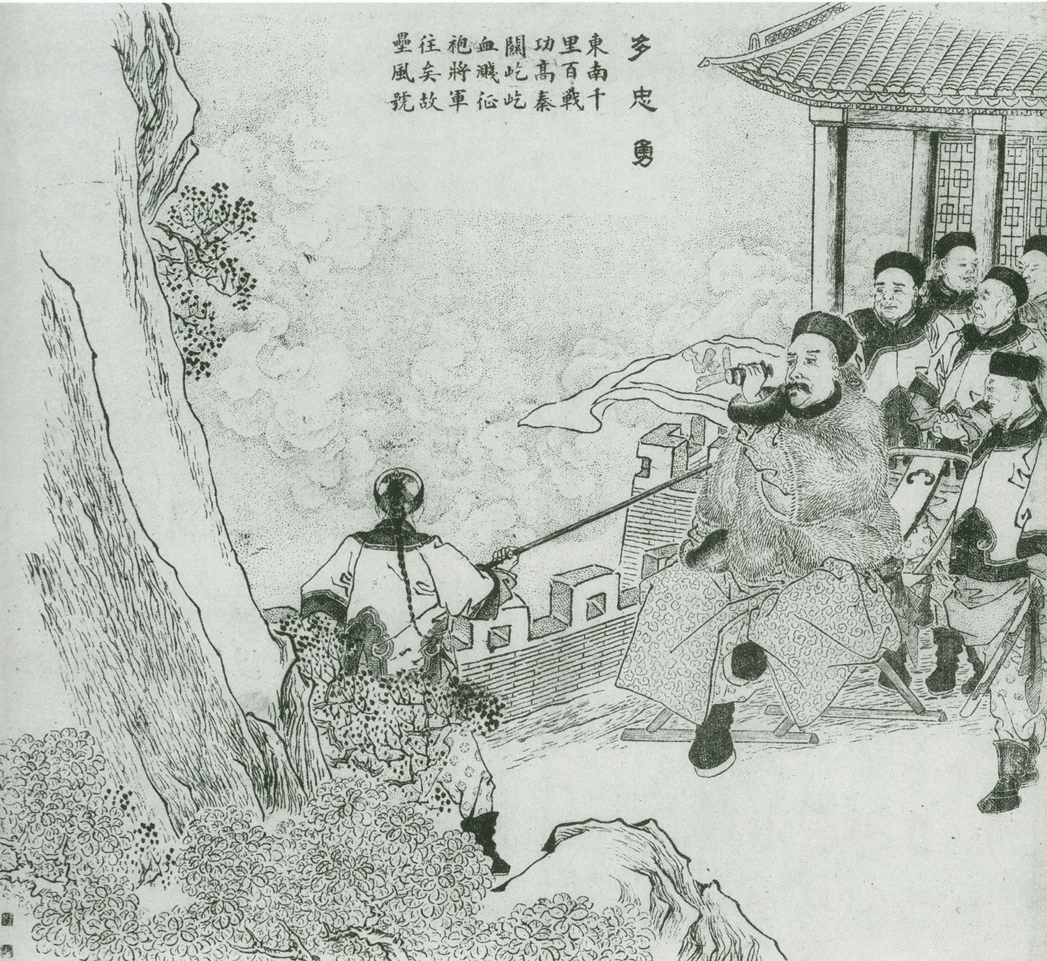 清代武职官吏。咸丰三年以骁骑校从胜保镇压太平天国北伐军,后从都兴阿转战湖北、安徽,多隆阿画像取自清光绪二十七年石印本《紫光阁功臣小像》,吴友如绘。