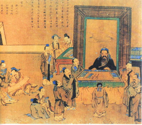 春秋末期思想家、政治家、教育家。儒家创始人。先世为宋贵族。少贫贱,曾任委吏、乘田、中都宰,鲁定公时官至司寇。因不满执政所为,去鲁而周游列国,皆不为所用。晚年返鲁聚徒讲学,弟子三千,贤者七十余人。孔子传曾整理《诗》、《书》等古代文献,删定鲁史《春秋》,成为中国第一部编年史著作,今存《论语》。孔子山东曲阜石刻像,北宋政和八年(1118)正月十五日刻,胡宁镌。孔子浙江绍兴石刻像,北宋宣和六年(1124)八月十五日刻,毛友行书赞,姚禹锡正书跋,陈谅镌。孔子像为南宋画家马远绘。孔子浙江杭州石刻像南宋绍兴二十六年(1156)十二月刻,李龙绘,宋高宗赵构正书赞,为《宣圣及七十二圣贤像》之一。孔子江苏江宁石刻像元至元三年(1337)十一月刻,唐吴道子绘,王渊摹,刘一夔等跋,郑楙镌。先圣像取自明吴嘉谟集校、程起龙绘、黄组刻孔圣家语图。明代孔子像为孔府珍藏。孔子上海松江石刻像明正统五年(1440)九月刻,杨政撰,金纯正书,夏衡篆额。孔子题跋版画像取自明天然撰赞,弘治十一年(1498)重刻本《历代古人像赞》。孔子半身石刻像藏曲阜文庙大成殿。圣迹图为明代无名氏绘。孔子全身画像为明代画家戴进绘。孔子山西长子石刻像,刻于明嘉靖十五年(1536)秋,徐固正书。孔子明代西安石刻像,明嘉靖四十二年(1563)六月十五日刻,唐吴道子绘,尚佐均记,孙应鳌行书并跋。清代刻孔子行教石刻像、孔子石刻像并赞均为为唐代吴道子绘。孔子湖南郴县石刻像,清顺治十三年(1656)四月刻,唐吴道子绘。孔子四川南溪石刻像,清康熙六十年(1721)十一月一日刻,唐吴道子绘,宋鉴跋。孔子画像现藏台北故宫博物院。孔子坐姿像取自明吕维祺编,崇祯刻本《圣贤像赞》。孔子清代西安石刻像,清雍正十二年(1734)九月十五日刻,和硕果亲王允礼绘。孔子坐牛车像取自明张路绘《问津图》,故宫博物院藏。